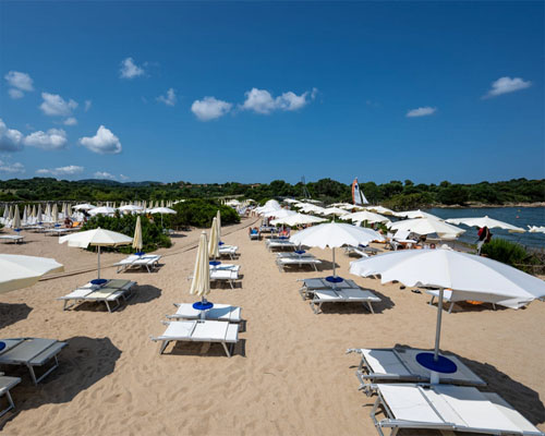 Spiaggia: Un’ampia zona protetta con rare piante, tra cui domina l’elicrisio, fa da cornice ad una splendida baia affacciata sul mare limpido e cristallino. La spiaggia è attrezzata con ombrelloni, lettini e sdraio. E’ raggiungibile con una passeggiata a piedi (10 minuti) nella macchia mediterranea o con servizio navetta. Il mare digrada dolcemente consentendo a tutti di fare il bagno.