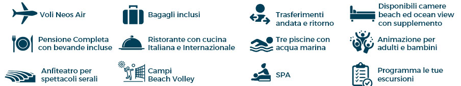 La struttura offre anche la possibilità di aggiungere il supplemento “All Inclusive” che include aperitivo di benvenuto, colazione, pranzo e cena con servizio a buffet presso il ristorante principale; break mattutino e pomeridiano rispettivamente alle ore 11:00 ed alle ore 17:00. Bibite, acqua, birra locale e alcolici locali sono serviti presso il bar principale dalle ore 10:00 alle ore 22:00. Al ristorante durante i pasti sono inclusi birra locale, acqua, bibite al bicchiere, caffè americano e tè. Sono esclusi gli alcolici importati e le bevande in lattina o in bottiglia.