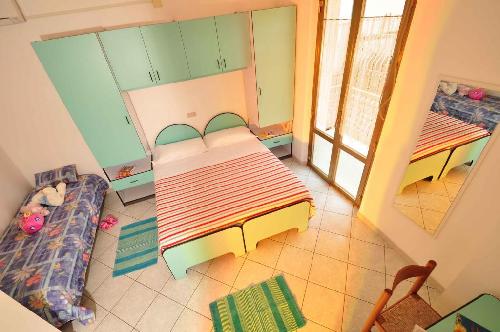 – Appartamento Bilocale 2-4 persone (circa 32 mq – occupazione massima 4 adulti): situati al 2° o 3° piano, a circa 100-250 metri dal mare (alcuni sopra l’anfiteatro dell’animazione). Sono composti da una camera da letto con letto matrimoniale e 1 letto singolo, soggiorno con poltrona letto e angolo cottura con lavello, frigorifero, posate e stoviglie.